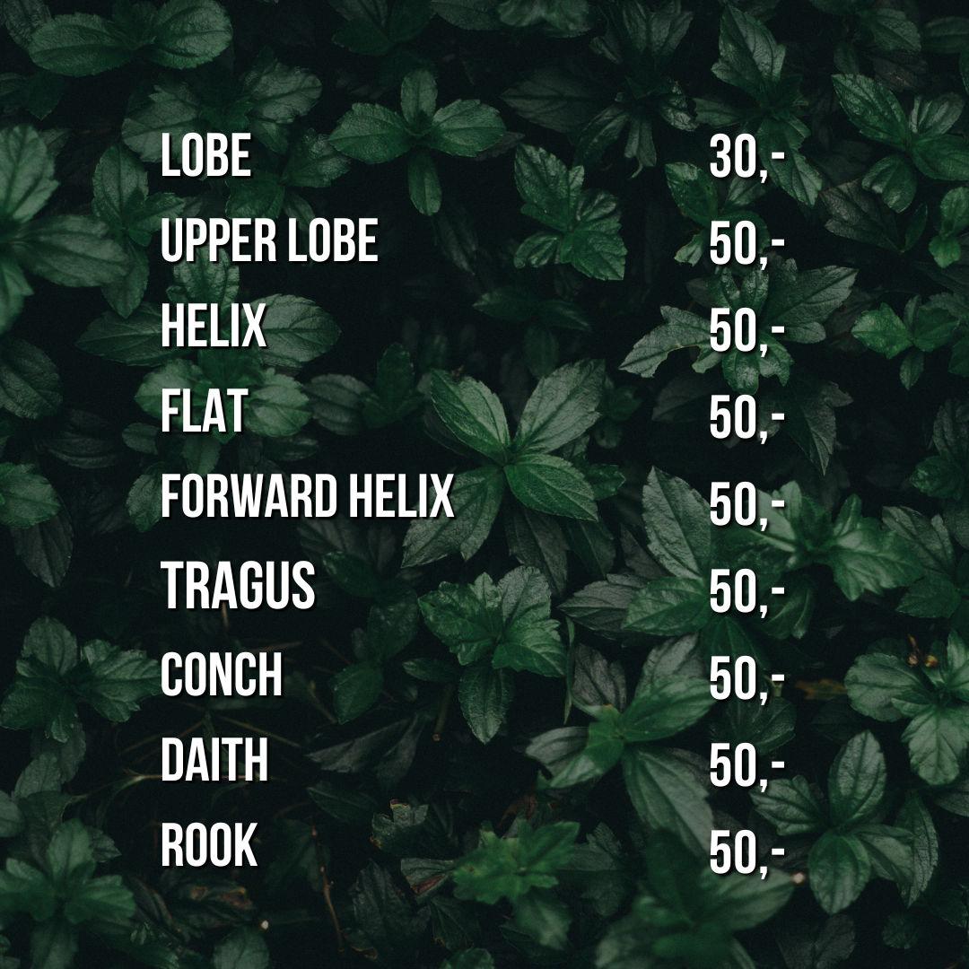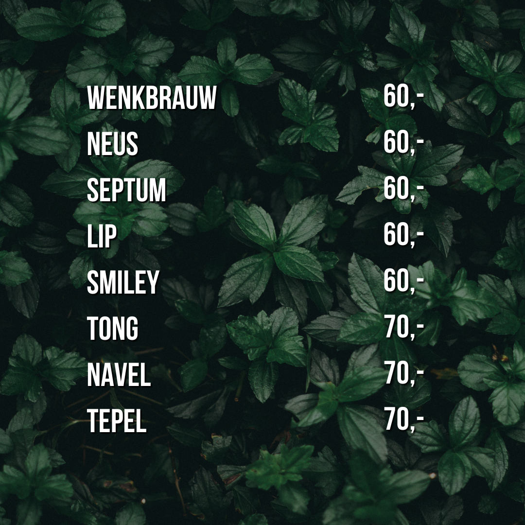 Alleen het beste voor jouw piercing. Op vaste dagen is onze piercer aanwezig voor al jouw piercing wensen. Onze piercer wordt regelmatig bijgespijkerd over de nieuwste trends en hygiëne voorschriften. Daarnaast werken wij met steriele wegwerp materialen en sieraden van de hoogste kwaliteit.